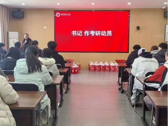 学院党委书记王乐给全体考研学子鼓劲动员,他从研究生报考人数变化趋势和本校硕士生招生情况出发,赞扬同学们在备考路上展现的坚韧意志与追梦精神,勉励考研学生合理规划时间、保持良好习惯、强化内生动力,以最佳状态迎接考试。当一份份精心准备的“考研加油包”从学院领导、老师手中递出的时候,同学们感受到师长的暖心叮嘱,纷纷表示将坚定信心,全力以赴,“一战成硕”。