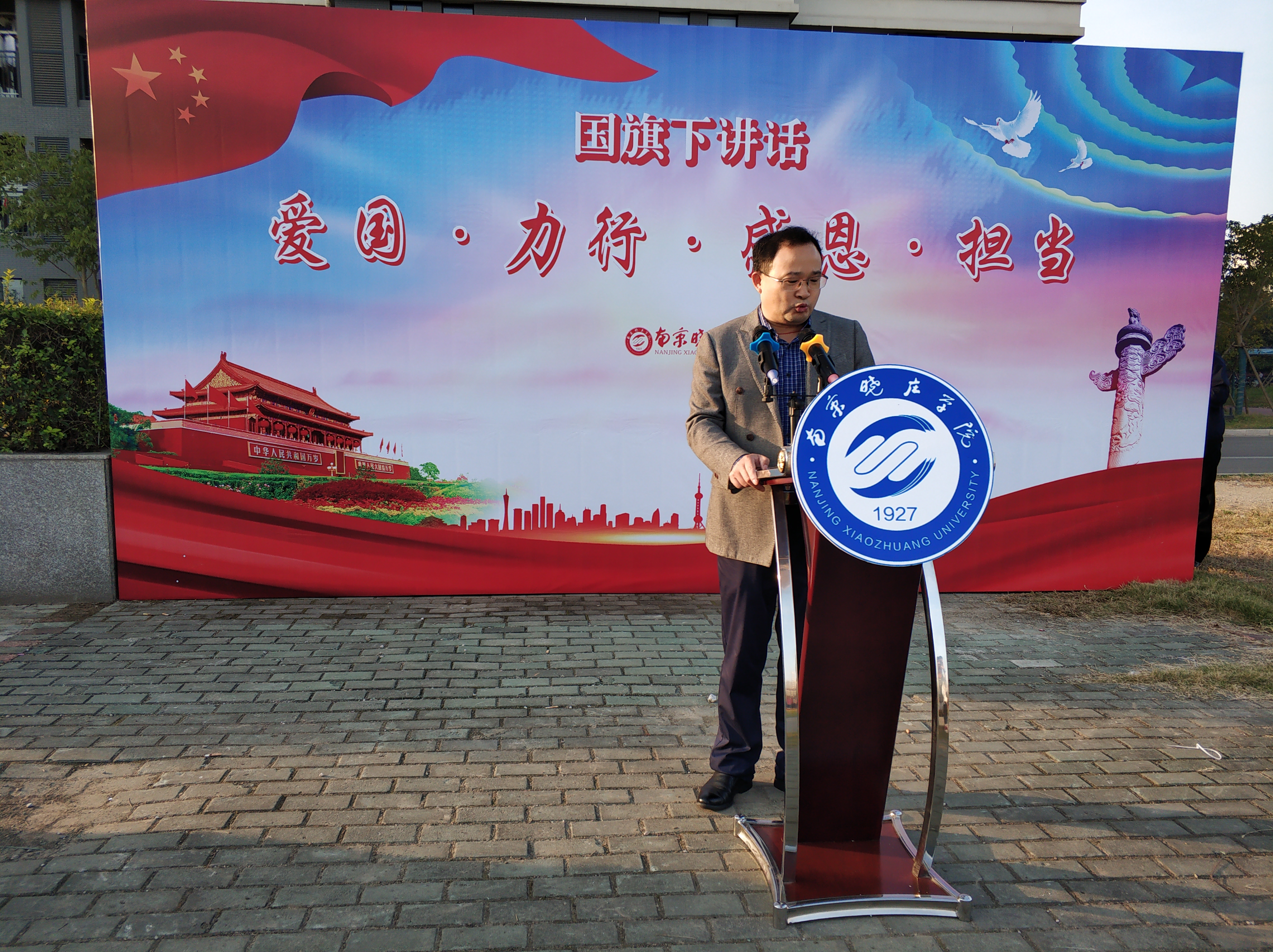 10月12日清早,我校升旗仪式在学校北操场隆重举行,商学院、音乐学院、美术学院和体育学院的全体学生、学生工作负责人、辅导员以及学生工作处相关人员参加了本次升旗仪式,商学院经济与金融专业负责人、我校2020年最美班主任王国林老师发表国旗下讲话。